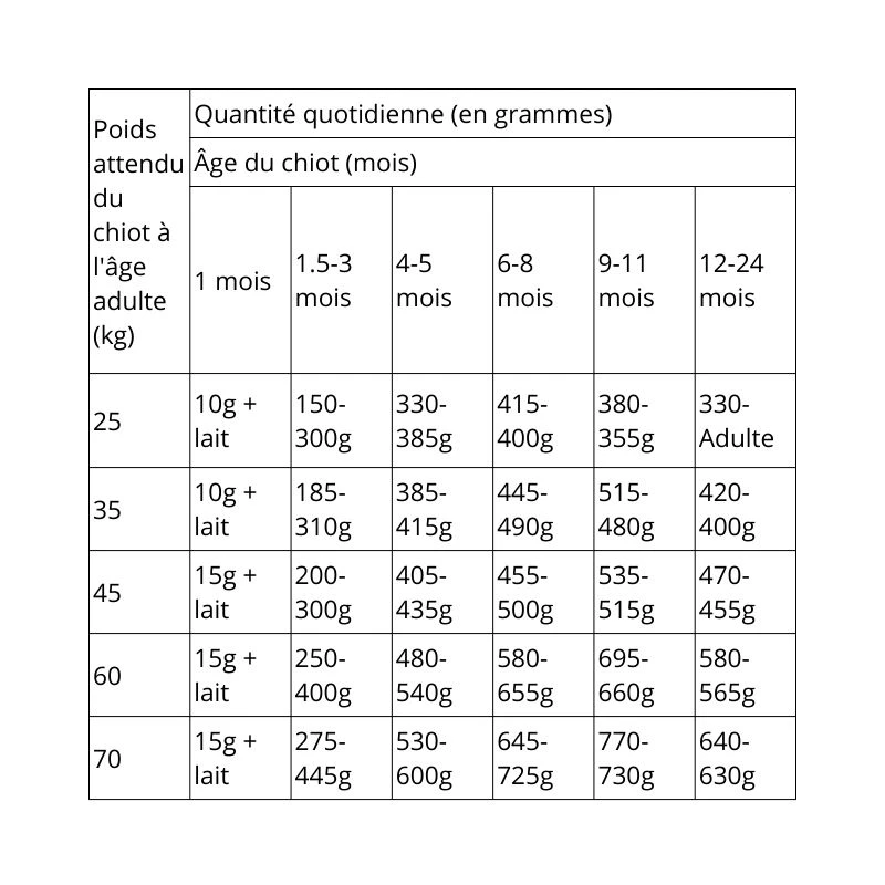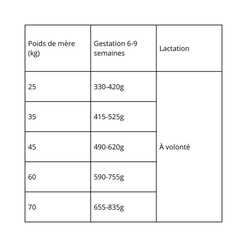 Consultez le tableau des rations quotidiennes conseillées. Ces quantités de rations sont fournies à titre indicatif. Afin de soutenir votre animal dans sa condition physique optimale, il est essentiel d'adapter les rations quotidiennes en fonction de son niveau d'activité, de sa condition physique et de ses besoins spécifiques. Il est important que votre animal ait toujours accès à de l'eau fraîche et propre. Assurer une surveillance régulière de sa santé et prener des rendez-vous réguliers chez votre vétérinaire.